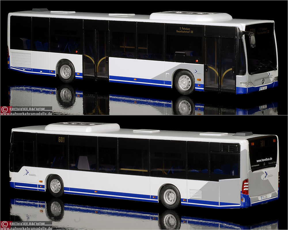 Eindecker MB O 530 Citaro Facelift Havelbus Verkehrsgesellschaft mbH Potsdam Hersteller: Rietze #66520 Erscheinungsjahr: 01/2008 Maßstab 1:87 (H0) Ziel: "601 S Potsdam Hauptbahnhof DB" |