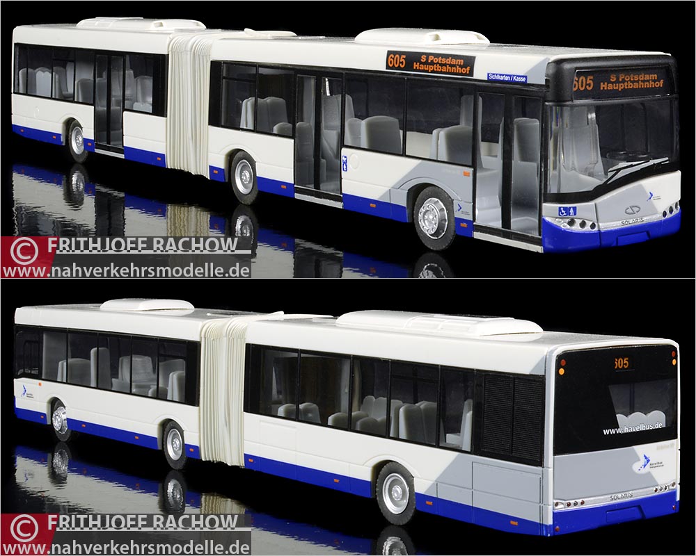 Gelenkbus Solaris Gelenkbus U18 Havelbus Verkehrsgesellschaft mbH Potsdam Sondermodell Auflage: 105 Stück Hersteller: VK-Modelle #08701103 Erscheinungsjahr: 01/2009 Maßstab 1:87 (H0) Ziel: "601 Bahnhof Teltow" |
