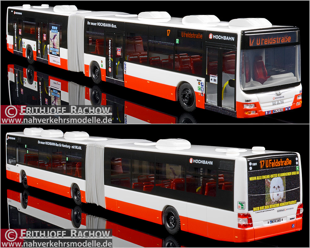 Bus MB O 405 G Hamburger Hochbahn AG - HHA Sondermodell Hersteller: Rietze #SIM10098 Erscheinungsjahr: 07/2014 Maßstab 1:87 (H0) Ziel: "E62 Eilbus U-Wandsbek-Markt" Kennzeichendruck: "HH – NA 1701“ Wagen 7701 XXL-Foto >> |